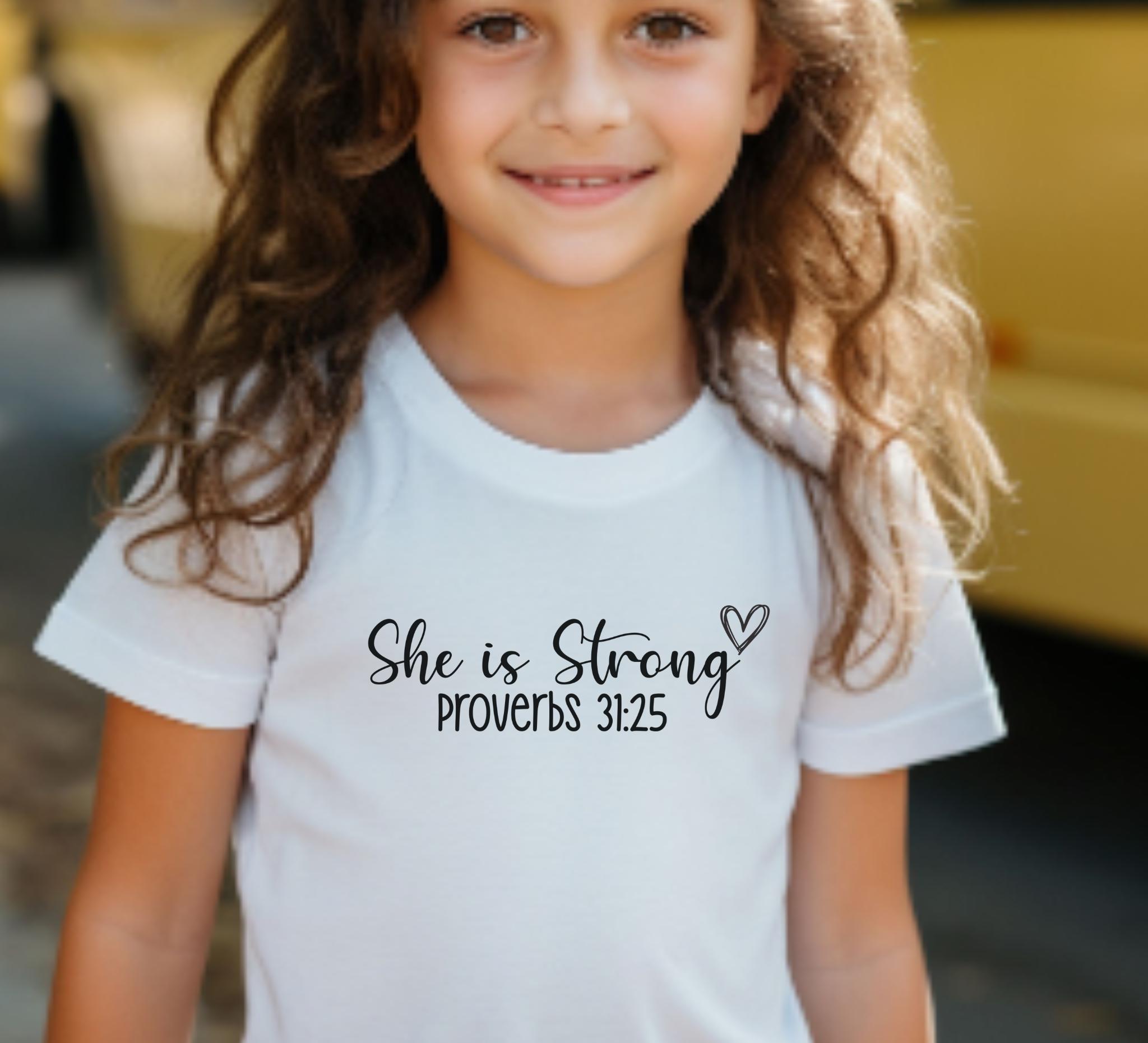 This youth short sleeve tee is a perfect blend of comfort and style, ideal for everyday wear. Made from ultra-soft, airlume-combed, ring-spun cotton, it provides a gentle touch that's perfect for play or relaxation. The uplifting message, "She is Strong - Proverbs 31:25," adds a positive vibe, inspiring confidence in young wearers. It's great for casual outings, school events, or simply lounging at home. This tee is especially relevant for birthdays, school celebrations, or religious occasions, making it a thoughtful gift for girls who appreciate style and empowerment. Whether it's paired with jeans or shorts, this tee makes a versatile addition to any wardrobe.