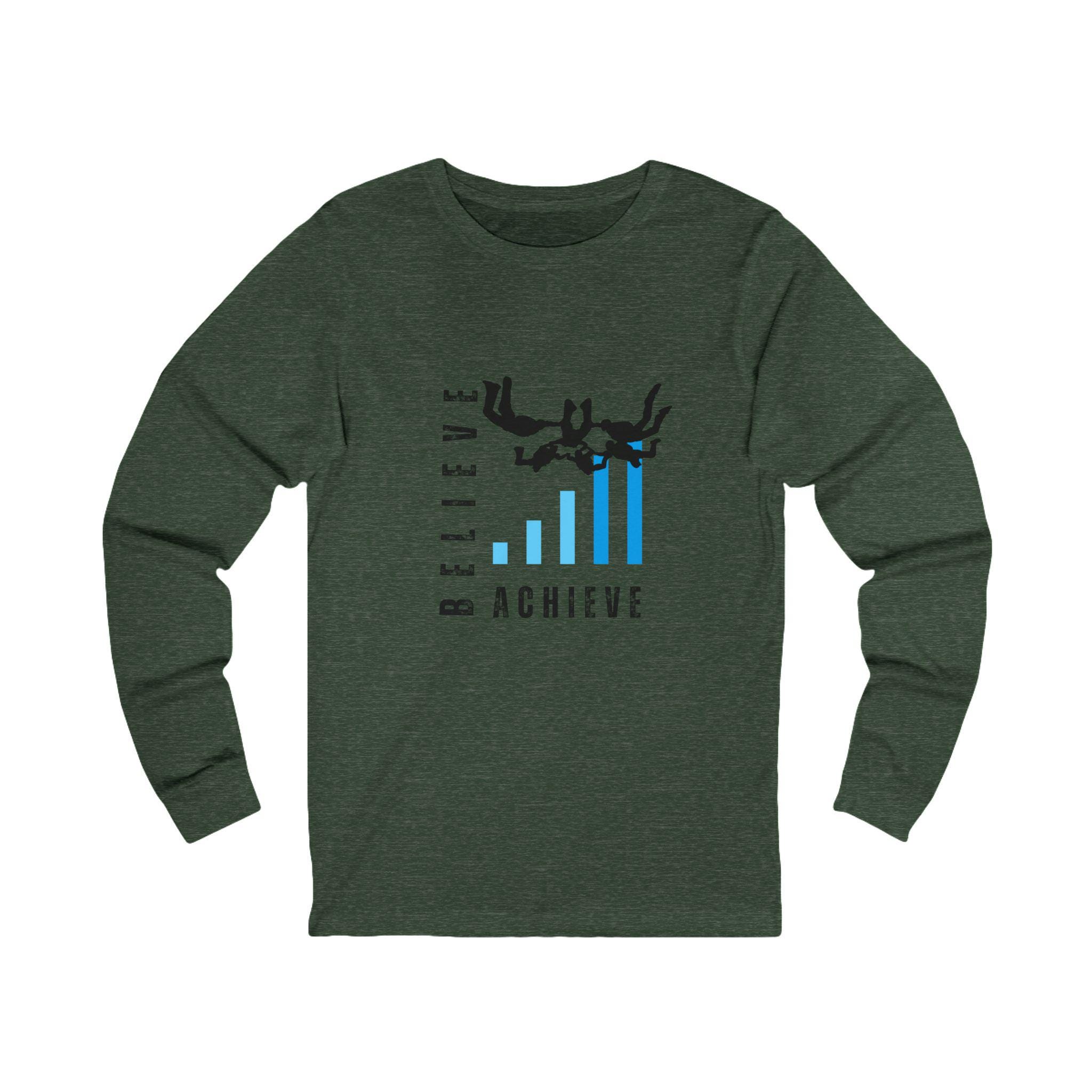Introducing the perfect blend of style and comfort with this Unisex Jersey Long Sleeve Tee. Designed for those who believe in achieving their goals, this tee is an inspiring addition to any wardrobe. Its soft fabric offers a cozy feel, making it ideal for both PT and skydive or freefall events. Whether you’re heading to a friend’s gathering, or heading to the drop zone, this tee provides effortless versatility. It appeals to adults of all ages, especially those who appreciate motivational designs. Perfect for gifting for jump school graduations, or as a thoughtful gift for New Year’s resolutions, this tee speaks to the achiever in everyone.