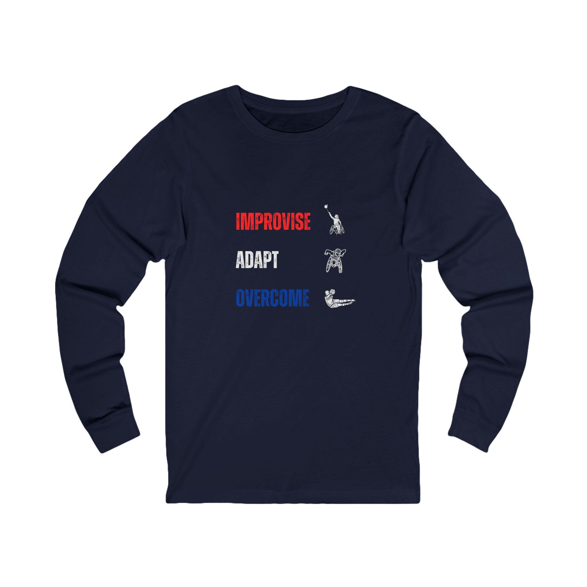 This long-sleeve tee is a quiet reminder to keep moving forward. Lightweight and soft against the skin, it wears like a trusted layer on early-morning runs, hanging with teammates, or weekend races. The front print feels like a coach’s nudge, and those words some know so well: improvise, adapt, overcome. It sits clean and centered on the chest, so the message reads easily whether you’re layering under a jacket or standing alone. The fit is retail and true to size, giving a neat, modern silhouette without feeling restrictive. Breathable cotton and subtle ribbed cuffs keep things comfortable, and the tear-away label means no irritation during long days. This tee slips into daily routines and moments that call for quiet grit.