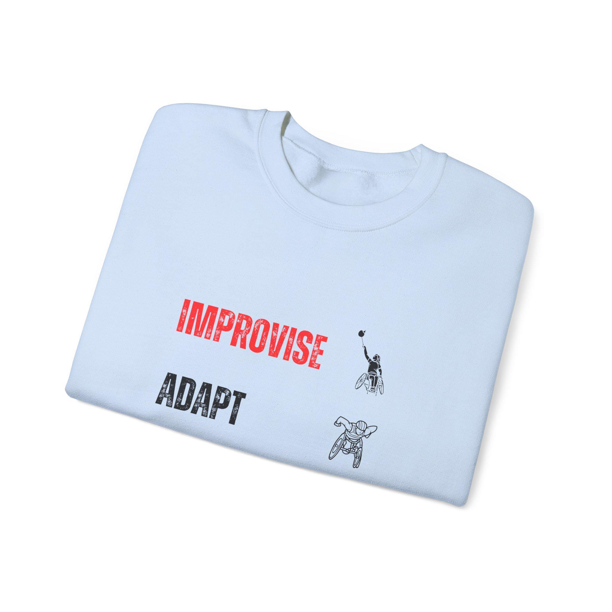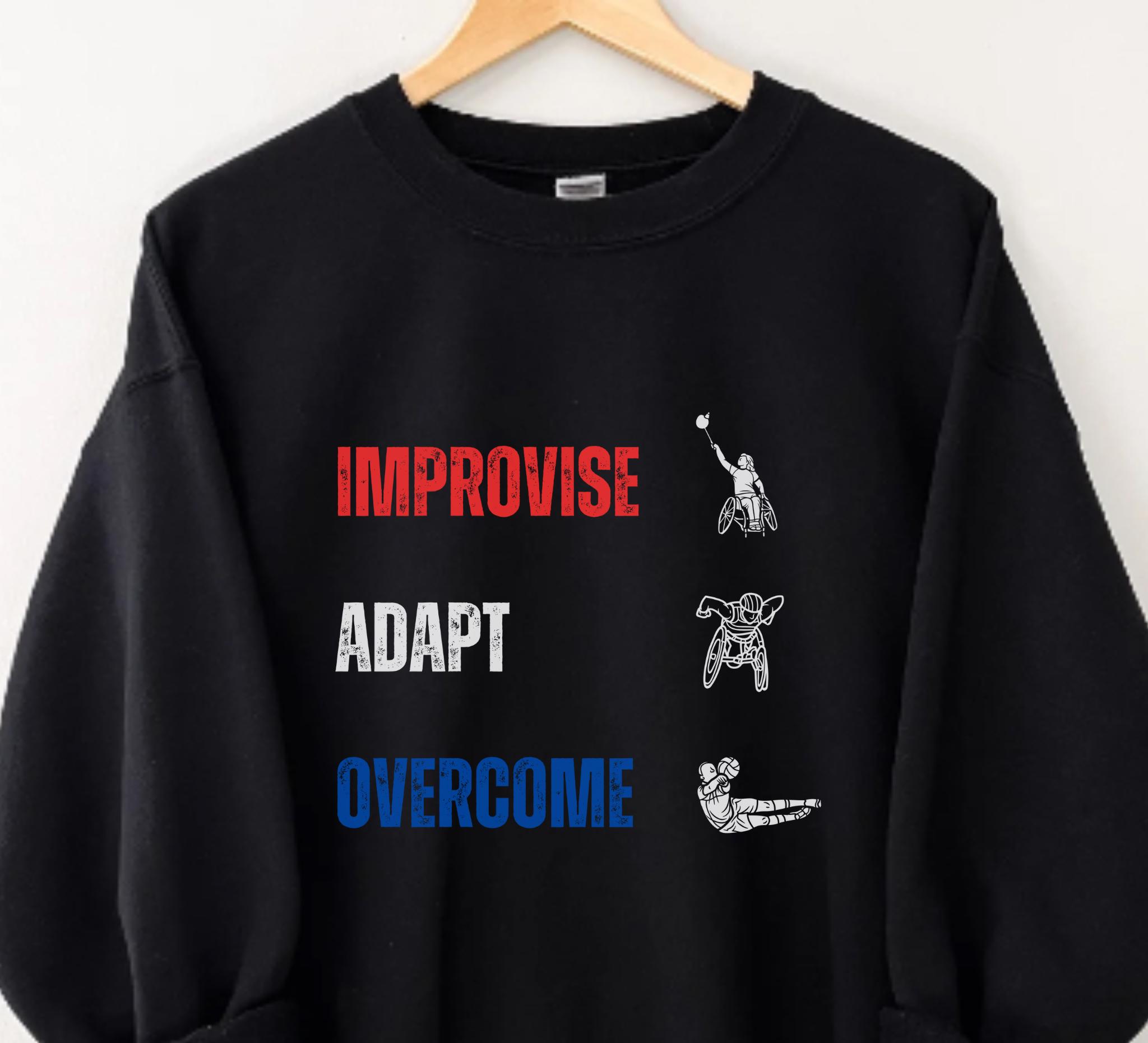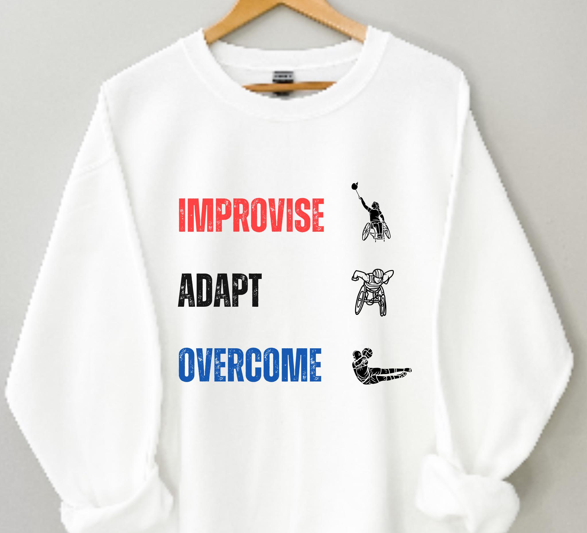Warm, dependable, and quietly bold — this crewneck carries a simple mantra across the chest: Improvise. Adapt. Overcome. The clean white canvas and crisp tri-color text make the message pop without shouting. Light embroidery-like graphics beside each word add a touch of playfulness and movement, so the sweatshirt feels lived-in and ready for whatever the day throws at you. Slip it on after an early morning run, on a long travel day, or when you need a little reminder to keep going. The fit is classic and forgiving, the fabric steady and reassuring: it’s the kind of layer you reach for when plans change and you want comfort that follows through.