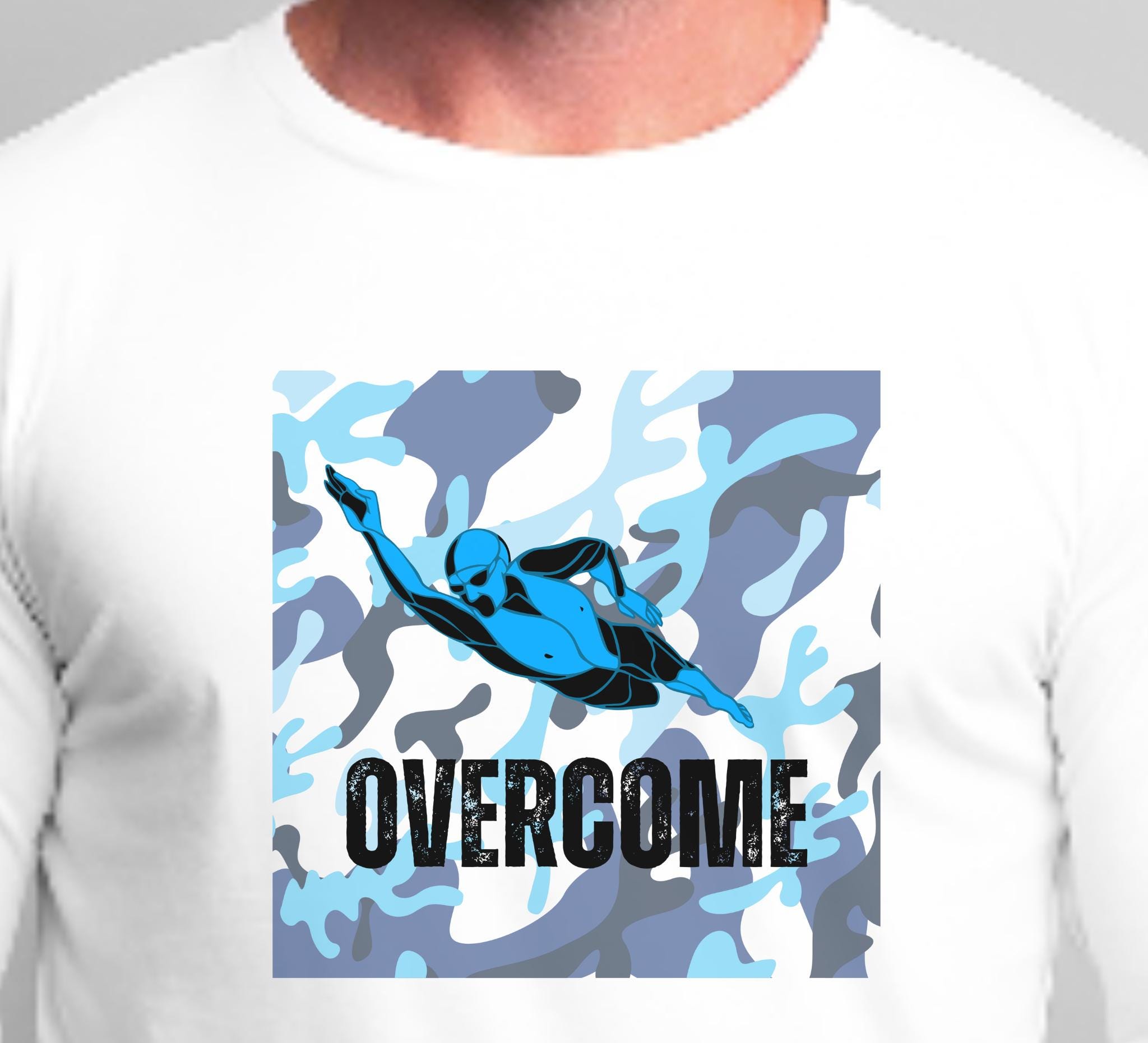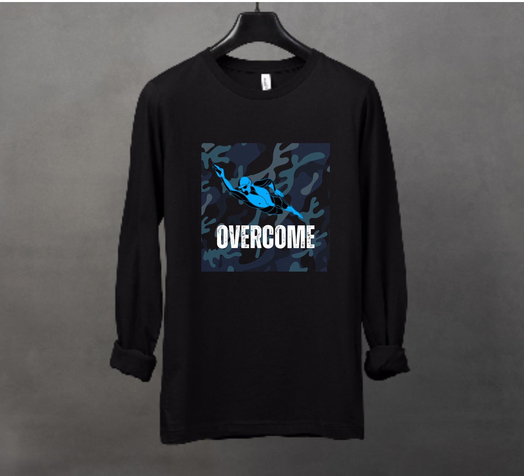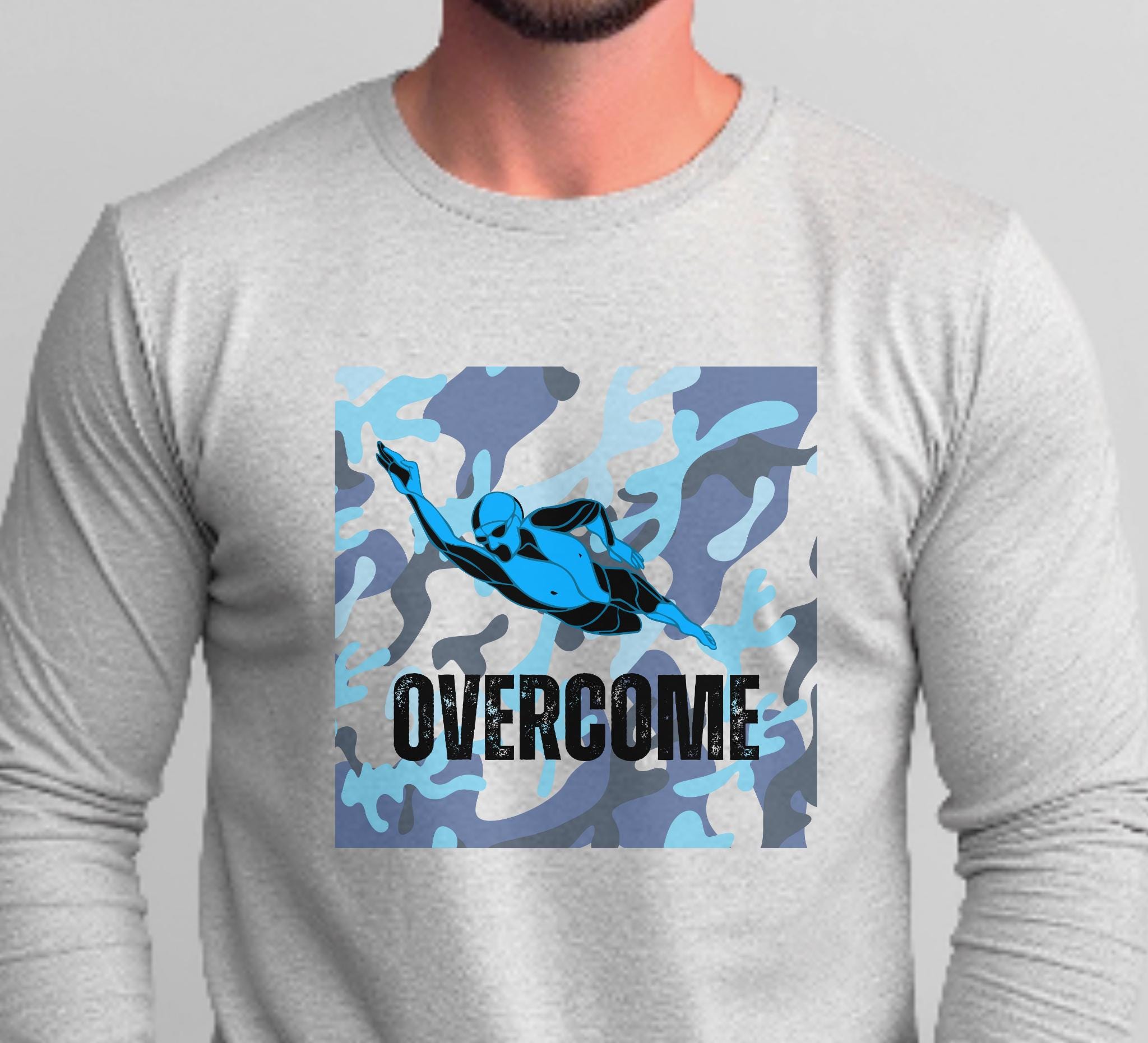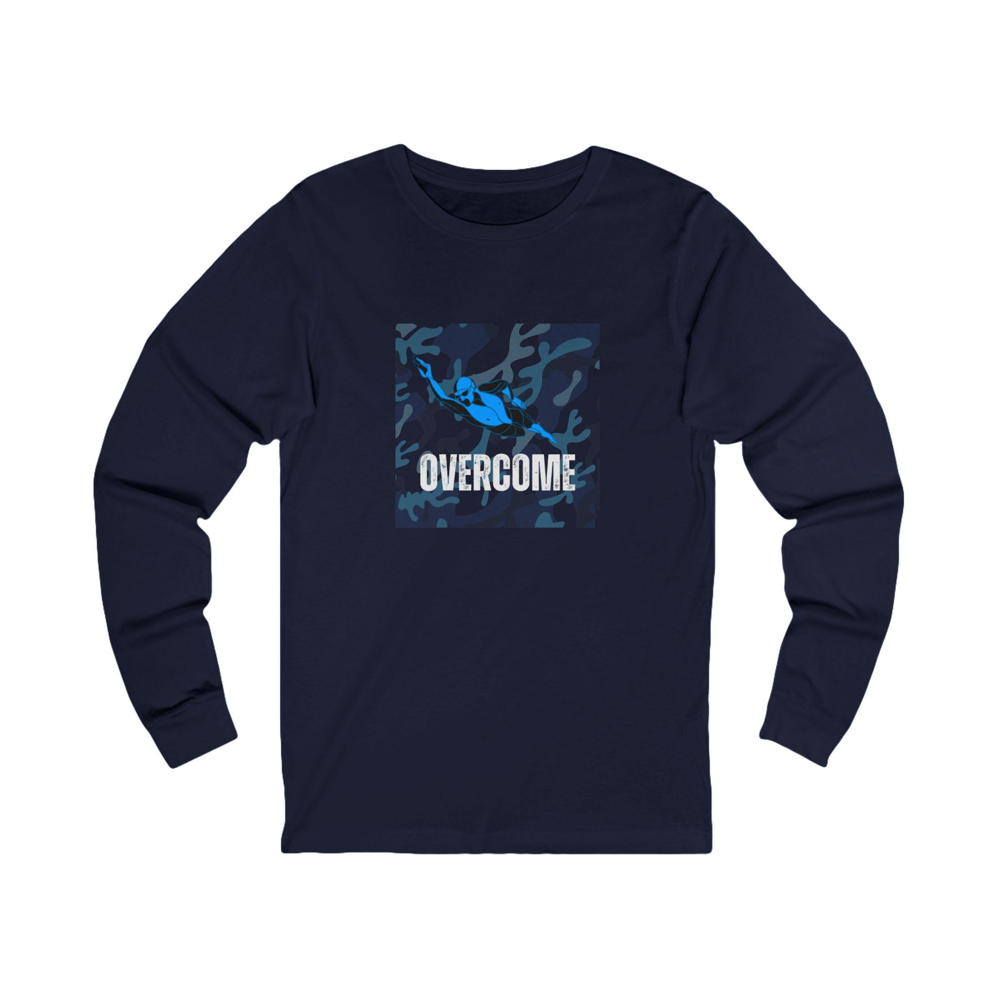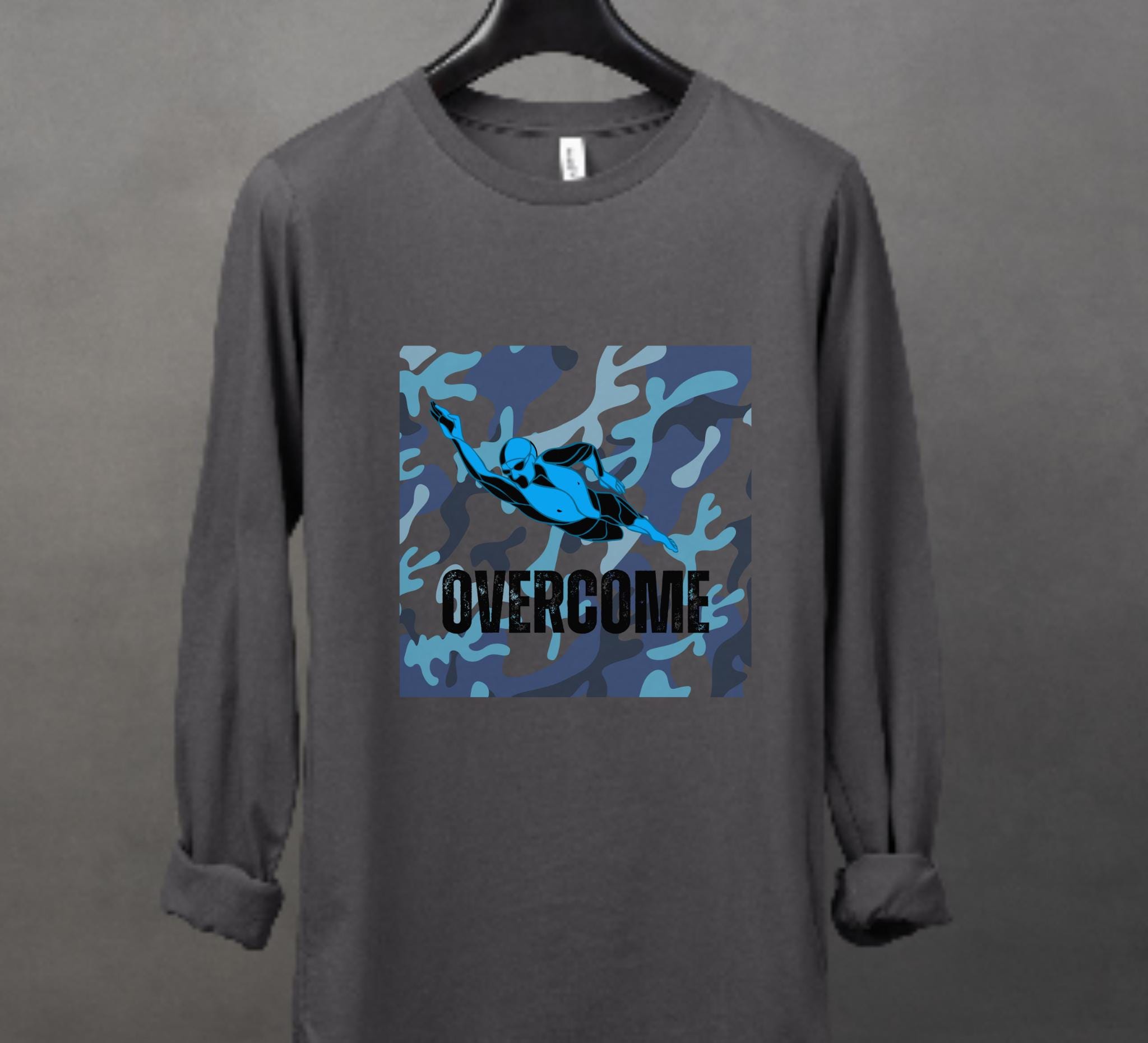 Lightweight, long-sleeve tee with a calm, resilient energy. A soft Airlume cotton body carries a cool-tone camo square on the chest, where a leaping blue whale and the word “OVERCOME” sit like a quiet reminder. It feels like a second skin—breathable, movable, and built to keep its shape through wear and wash. Wear it on chilly mornings, layered under a jacket, or solo on breezy evenings to anchor your day with a steady, hopeful note.