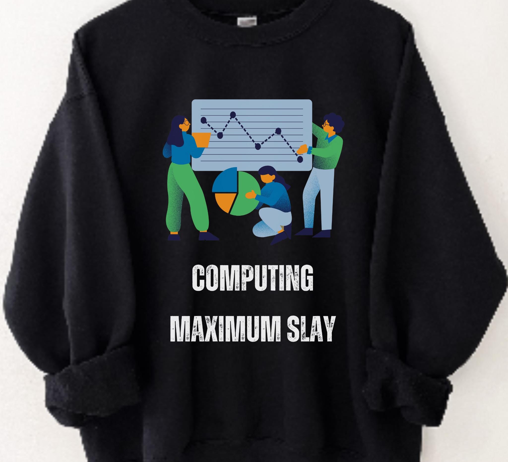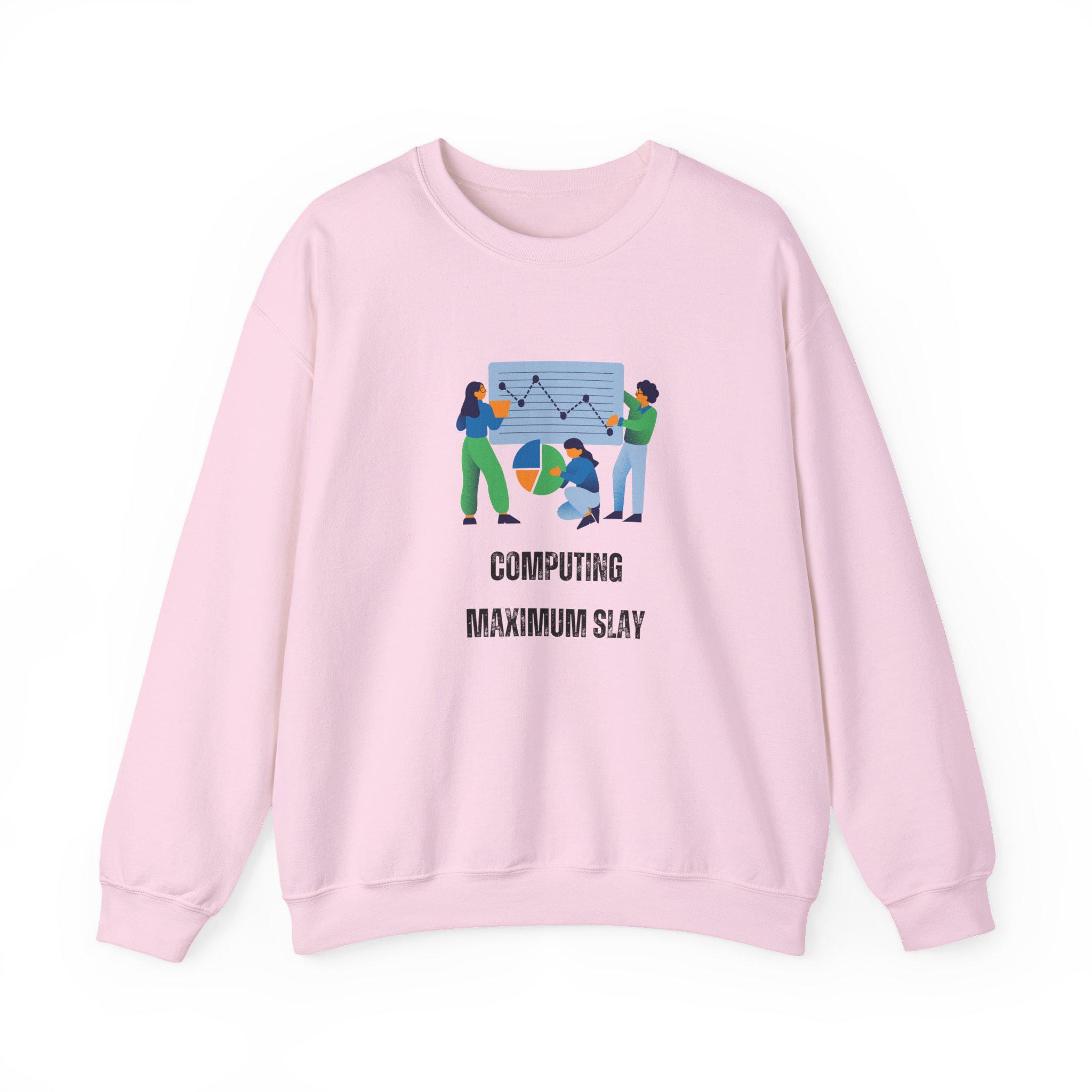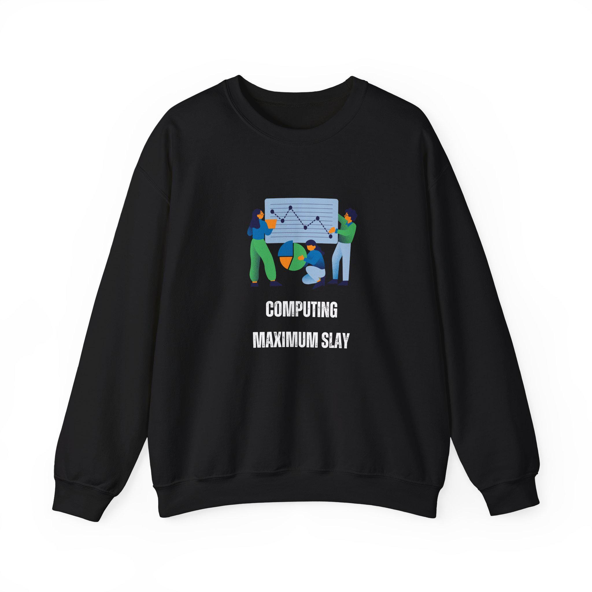 This crewneck sweatshirt brings quiet confidence to long coding sessions and campus walks alike. Soft, medium-heavy fleece holds shape around the ribbed collar and cuffs, while a clean, tubular knit silhouette keeps the look minimal and comfortable. The front design — playful figures, charts, and the bold humorous phrase — nods to data-crunching, group projects, and late-night breakthroughs, all while conveying your shine! It layers easily over tees or under a jacket, becoming the sweatshirt you reach for when you want to feel capable, seen, and a little bit cheeky during study marathons, hackathons, or casual meetups.