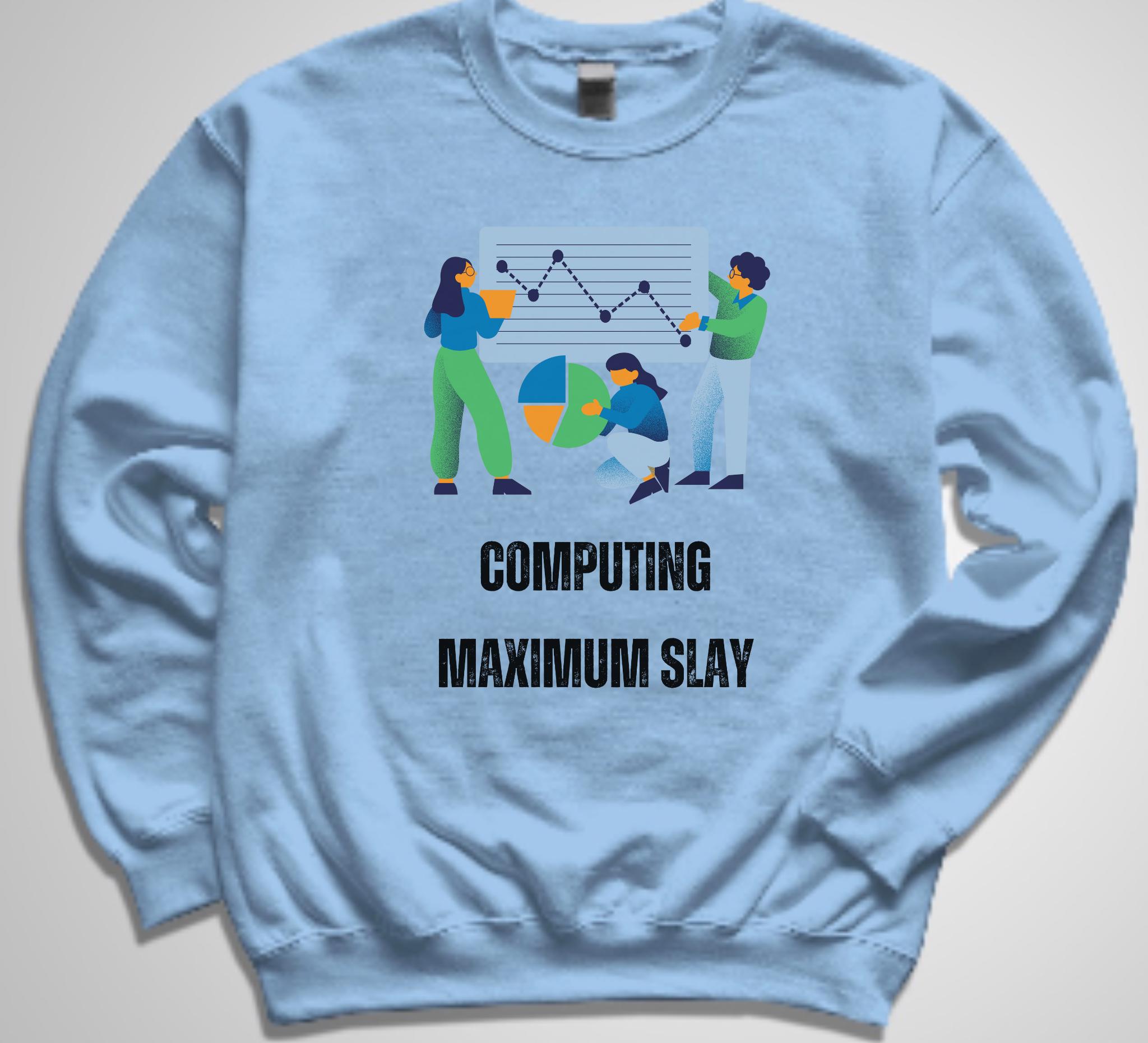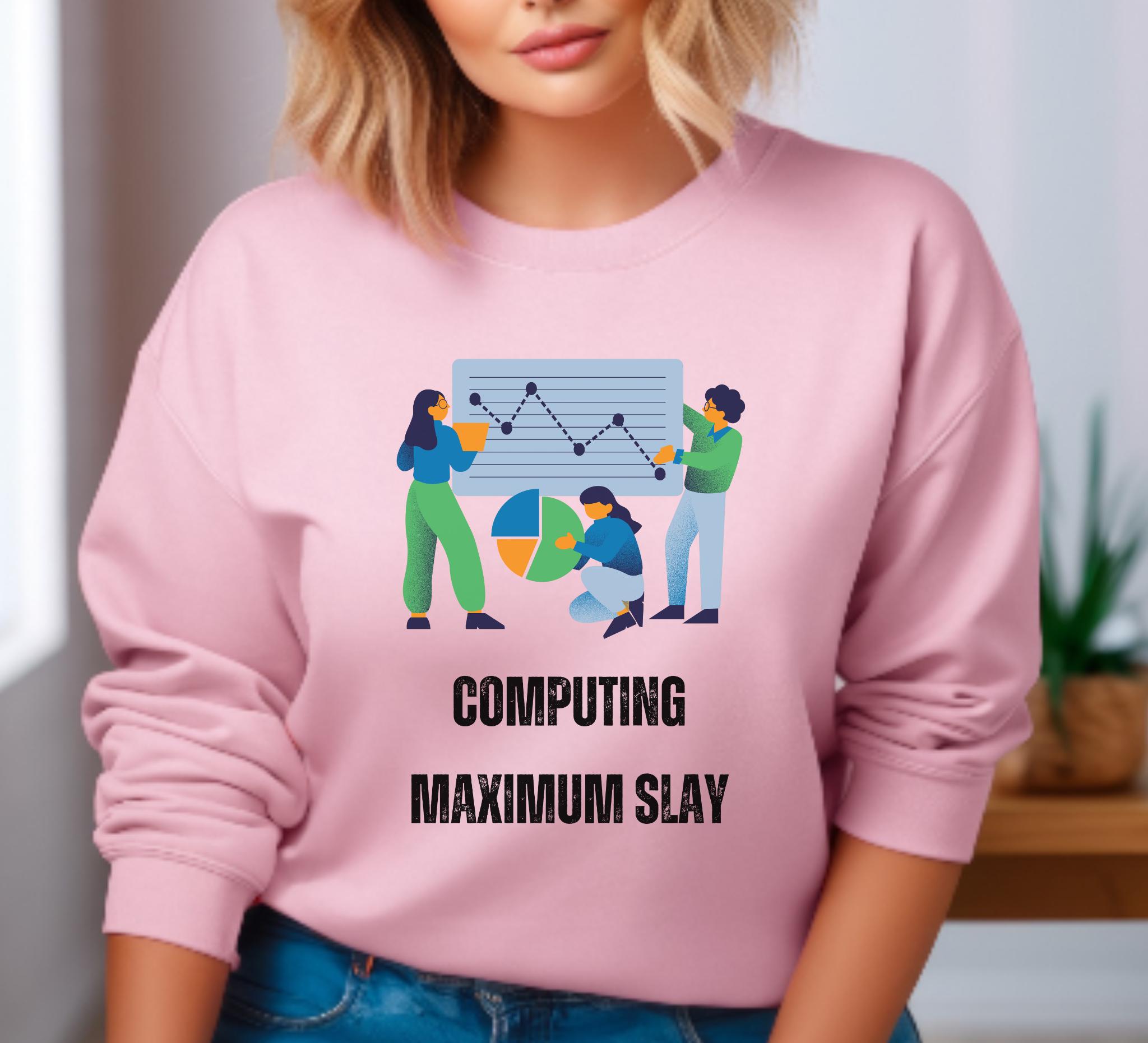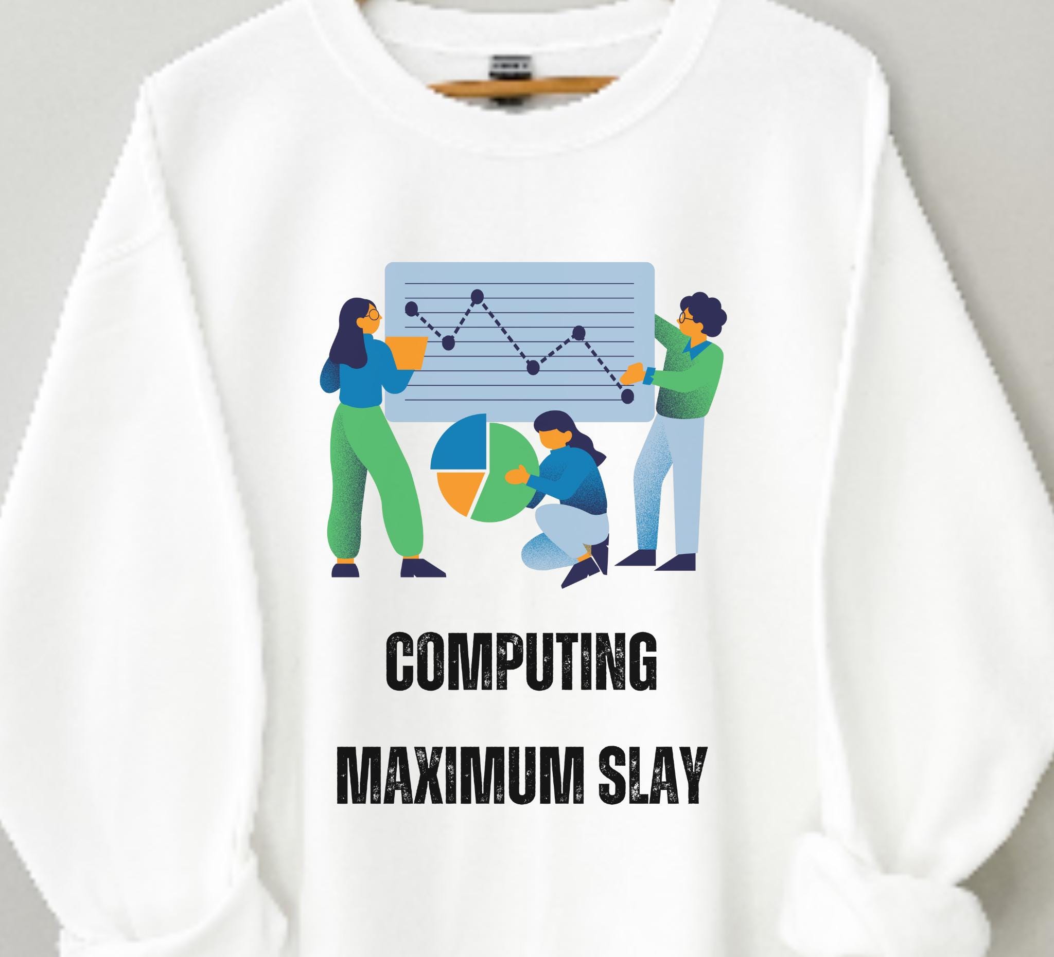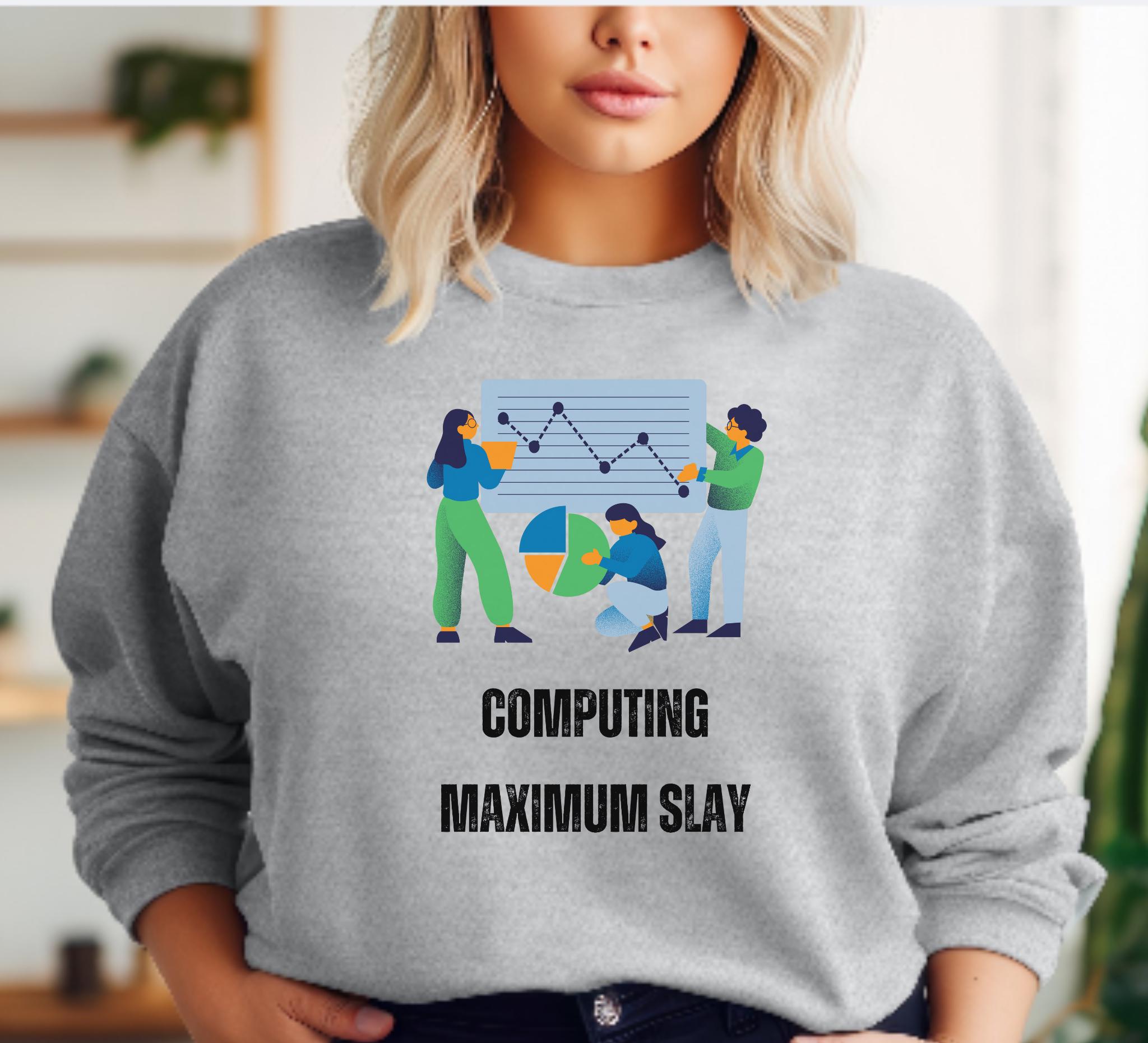 This crewneck sweatshirt brings quiet confidence to long coding sessions and campus walks alike. Soft, medium-heavy fleece holds shape around the ribbed collar and cuffs, while a clean, tubular knit silhouette keeps the look minimal and comfortable. The front design — playful figures, charts, and the bold humorous phrase — nods to data-crunching, group projects, and late-night breakthroughs, all while conveying your shine! It layers easily over tees or under a jacket, becoming the sweatshirt you reach for when you want to feel capable, seen, and a little bit cheeky during study marathons, hackathons, or casual meetups.