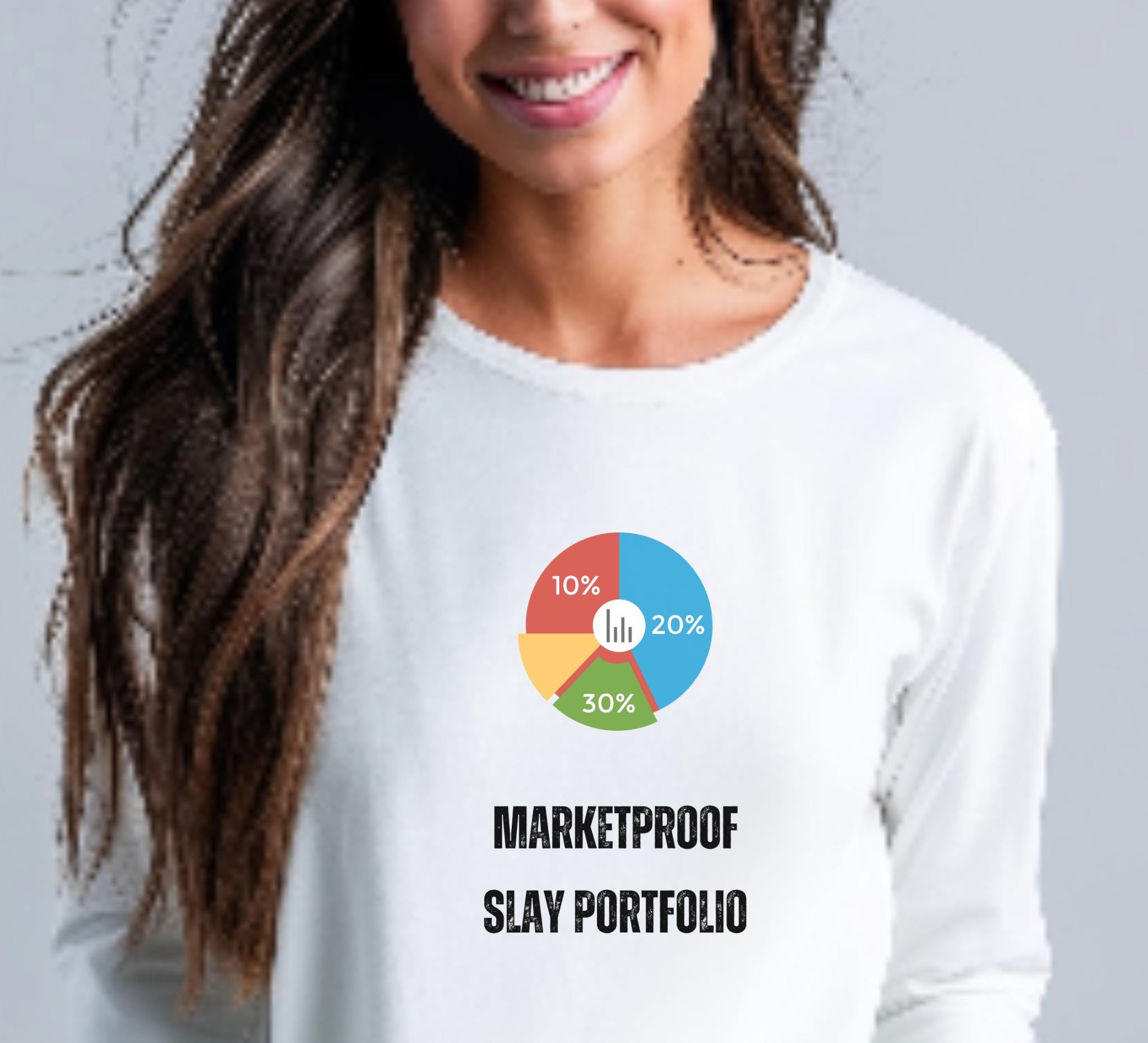 Is your Slay so strong... it's marketproof? Have you invested so well in your Slay, it's unbeatable? Then this lightweight, breathable, and wearable jersey tee is for you. It feels like it was made for those who have now harnessed the strength of their investments. A clean crew neckline and retail fit give it a tidy silhouette that layers easily under a blazer or wears alone with jeans. The chest print shows a colorful pie-chart visual and bold, stenciled text that reads like a design brief turned slogan — smart, slightly ironic, and confidence-forward. Wear it to signal your confidence, whether you’re pitching, networking, hustling, or just being. You've worked hard to marketproof your Slay. Now go out there and show it!